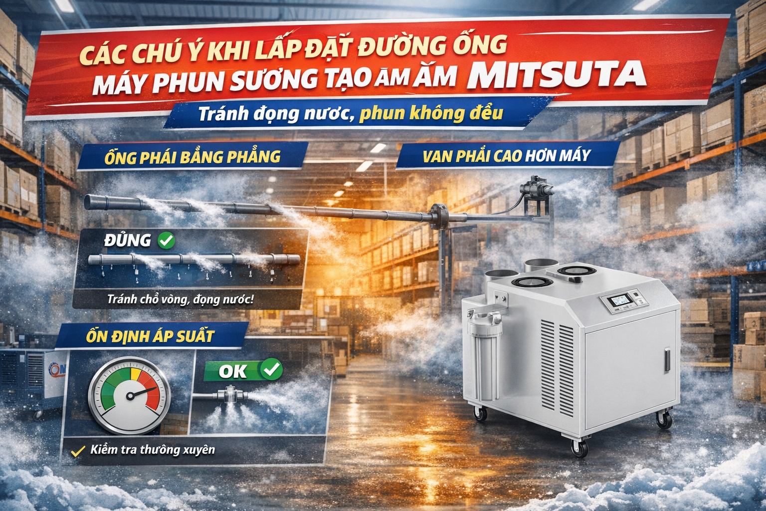 Lắp đặt đường ống máy phun sương tạo ẩm Mitsuta đúng tiêu chuẩn không chỉ giúp:
